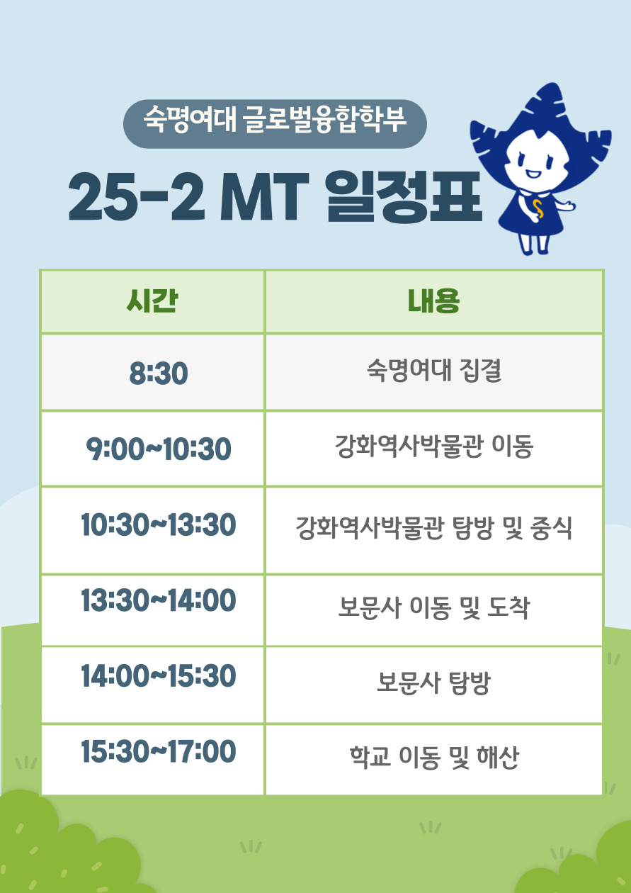숙명여자대학교 글로벌융합학부에서는 재학생 간 교류와 한국 문화 체험을 위해 2025학년도 2학기 MT(문화탐방 프로그램)을 아래와 같이 진행합니다.